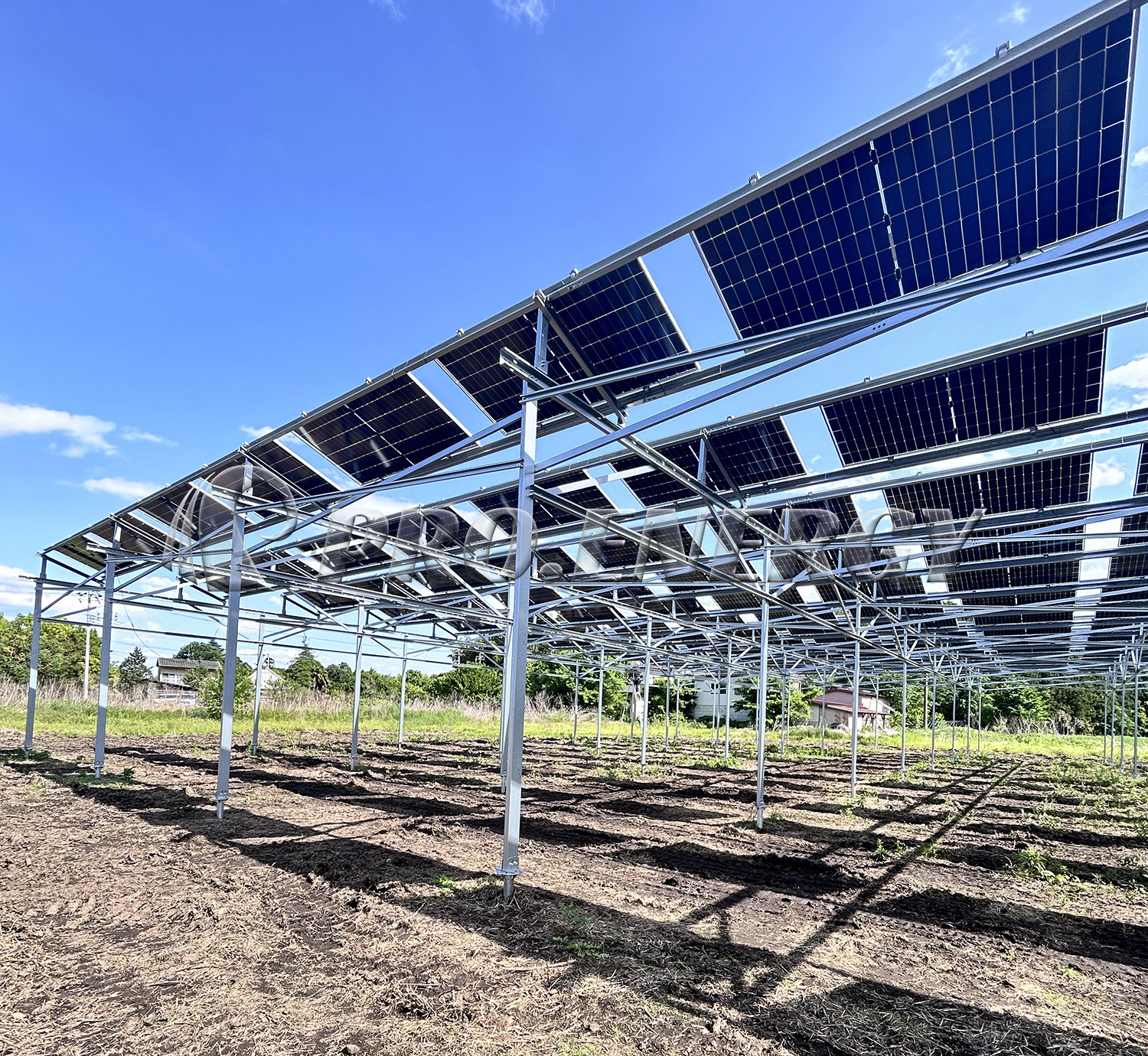The largest Agricultural PV mounted system in Japan ,supplied by PRO.ENERGY , has successfully completed the first-state construction. The whole project with capacity of 5MWp is conducted of carbon steel S350 for robust structure is also widely used in the overhead Agri PV mounted system due to this system require a large span for passing through of large equipment.