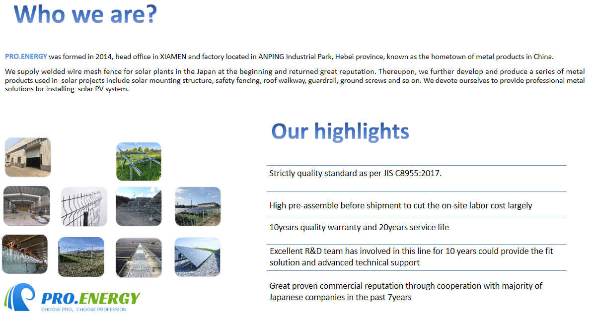 We are professional manufacturer for solar mounting structure, ground piles, wire mesh fencing used in the solar PV system.
