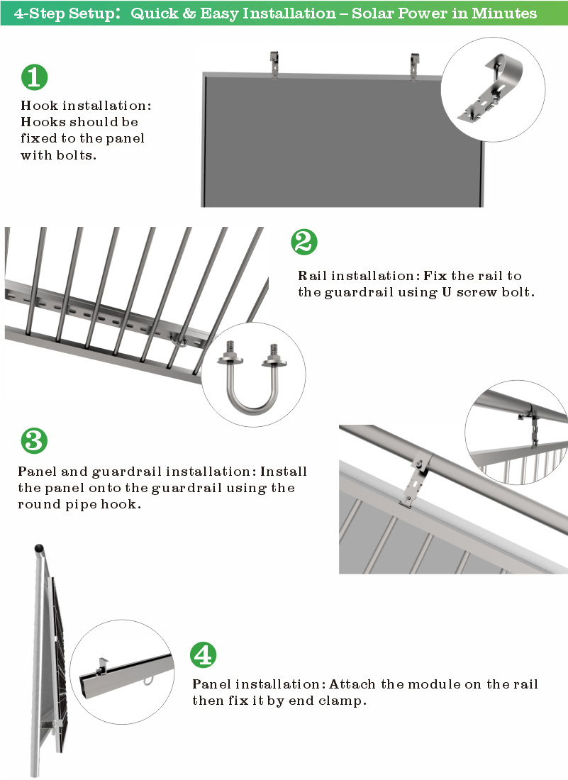 Our balcony solar mounting solution unlocks accessible green photovoltaic power for urban residential scenarios. It fits perfectly with apartment complexes, private dwellings and rental property balconies, efficiently converting idle balcony space into reliable household clean energy stations.